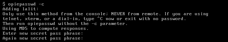 Use the following command to enable the OPIE for the new user. Be careful, Once this gets enabled you will not be able to access the system with the normal password.