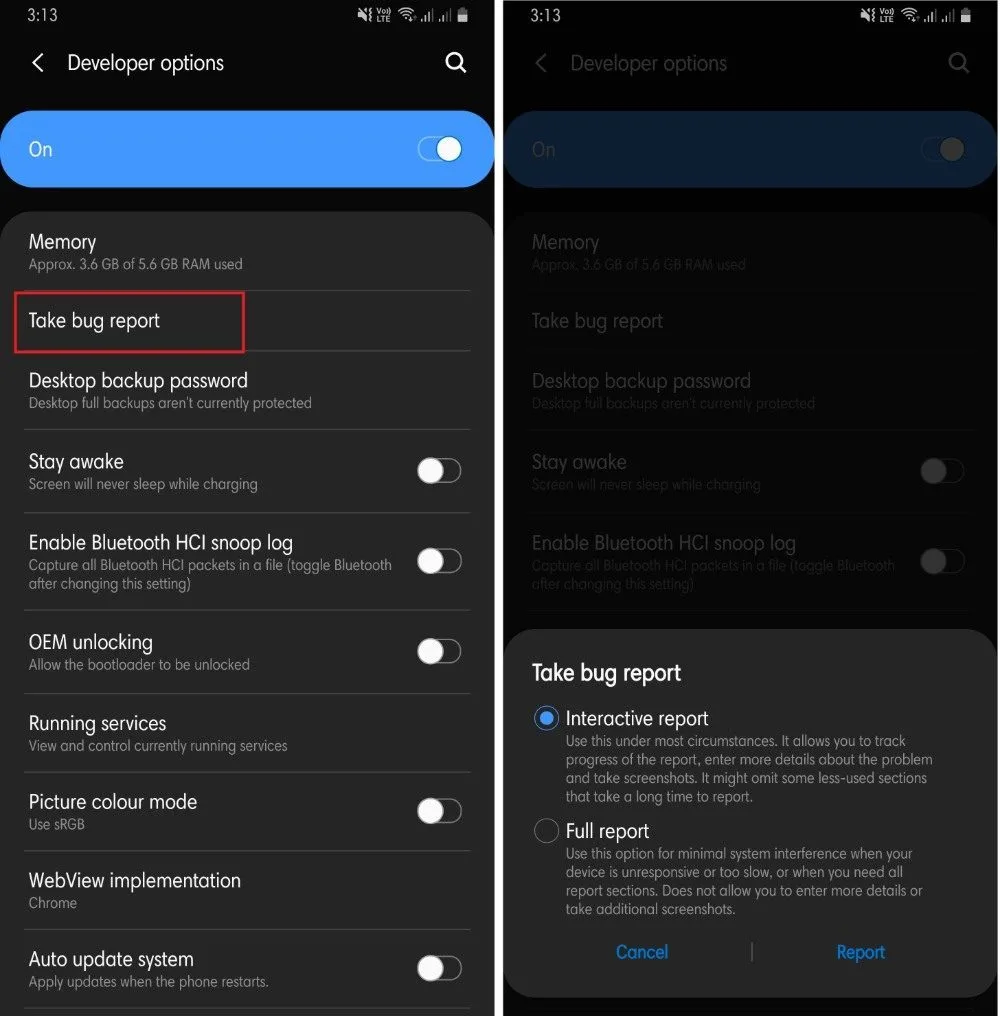 - Then, quickly head to the Settings >> Developer options and tap on “Take bug report”.