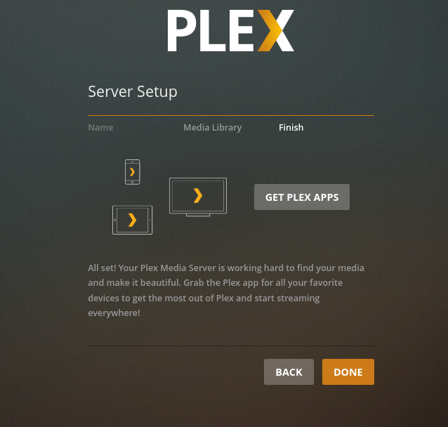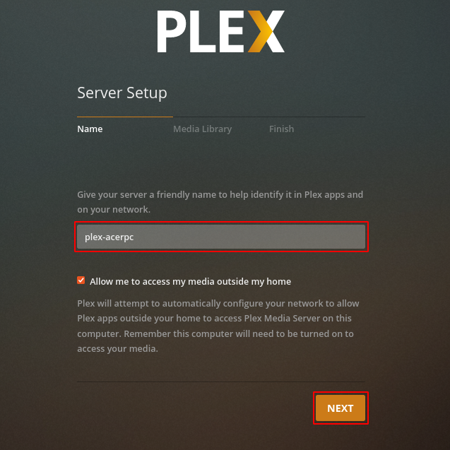 Once you get logged in you need to configure a few things. After login, on the first screen, it will ask you to enter the server name. Choose a friendly name so that it can easily be identified by plex apps and your network. After choosing a name click on NEXT to move to the next screen.