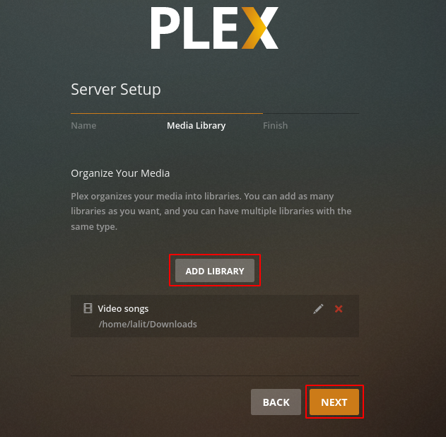 Plex organizes media on your system into libraries. You can add as many as libraries you want it could be of the same type. Click on ADD LIBRARY and select the media folder from your system to add it into a library.