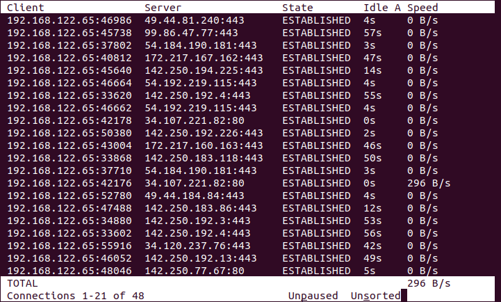 The tcptrack command is quite similar to iftop command. It captures packets and calculates network bandwidth for each TCP connection, it uses pcap library to do so.