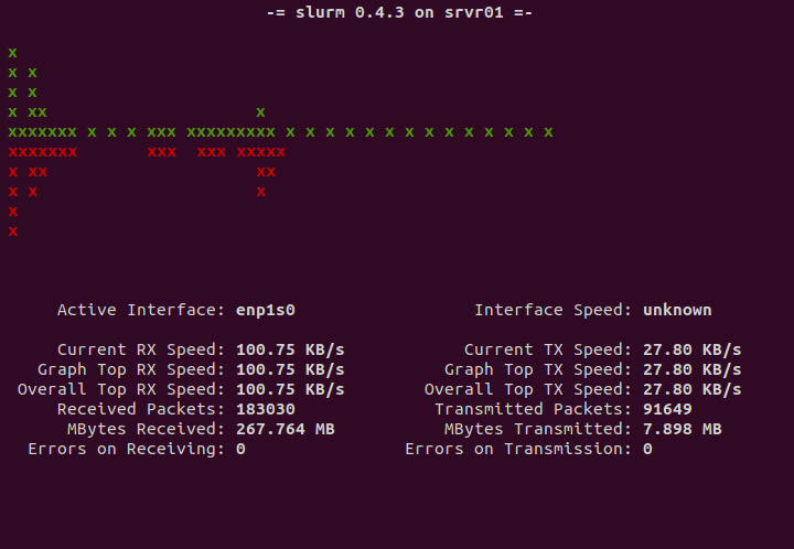 The slurm is a system workload manager, we can use it to monitor network traffic on a system. It shows device statics with an ASCII graph. It supports three types of graphs which can be activated using the c, s, and i keys.