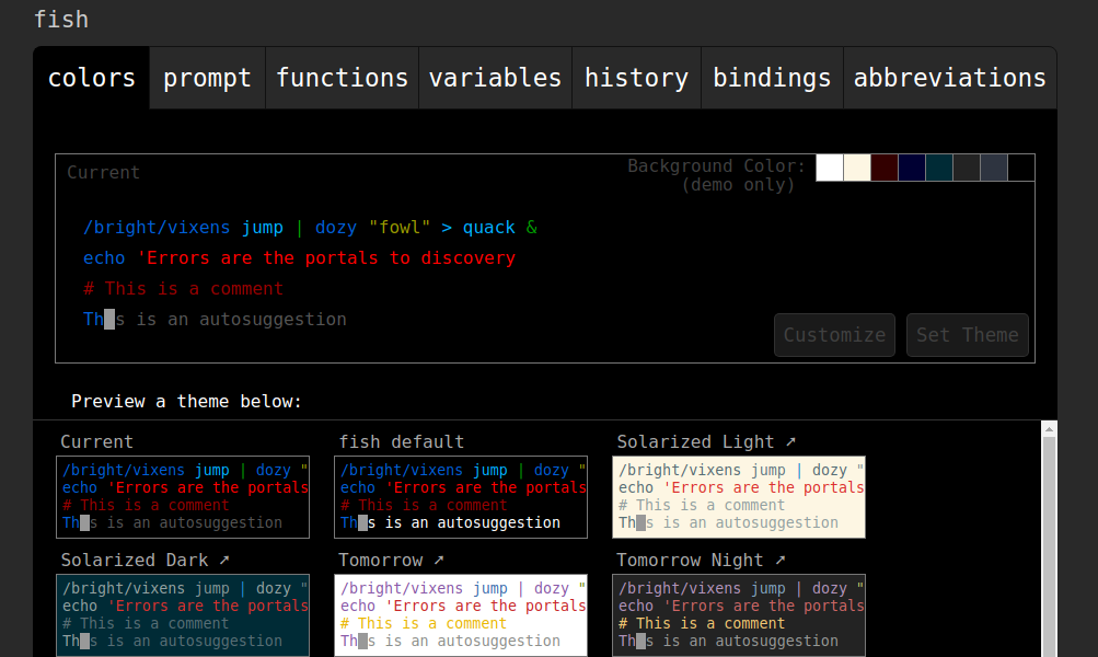 To configure shell write fish_config on command prompt and press enter. This will open the configuration settings in your default web browser. Here you can choose the color, set a new prompt, can see the history of commands executed. The image given below shows the configuration menu –