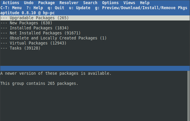 Aptitude is a high-level interface to the package manager. It provides a terminal menu interface that is not provided by apt. It is a transaction based package management service. If you consider only command-line interfaces apt and aptitude are quite similar to each other. Installation, removal, up-gradation of a package can be performed with a single key command. To access the aptitudes terminal menu type the command $sudo aptitude into your terminal and press the enter.