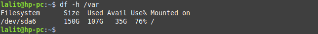 If you want to view disk space usage of a specific filesystem lets say /var then use the following command in your terminal –