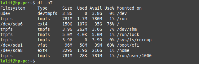 When the df command is used without any argument it shows the summary of disk space usage by the currently mounted filesystems. I will recommend using the option -h with the df command so that you get the output in human-readable form.