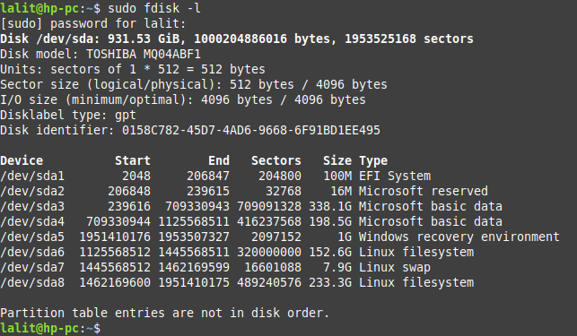 sudo fdisk -l /dev/sda