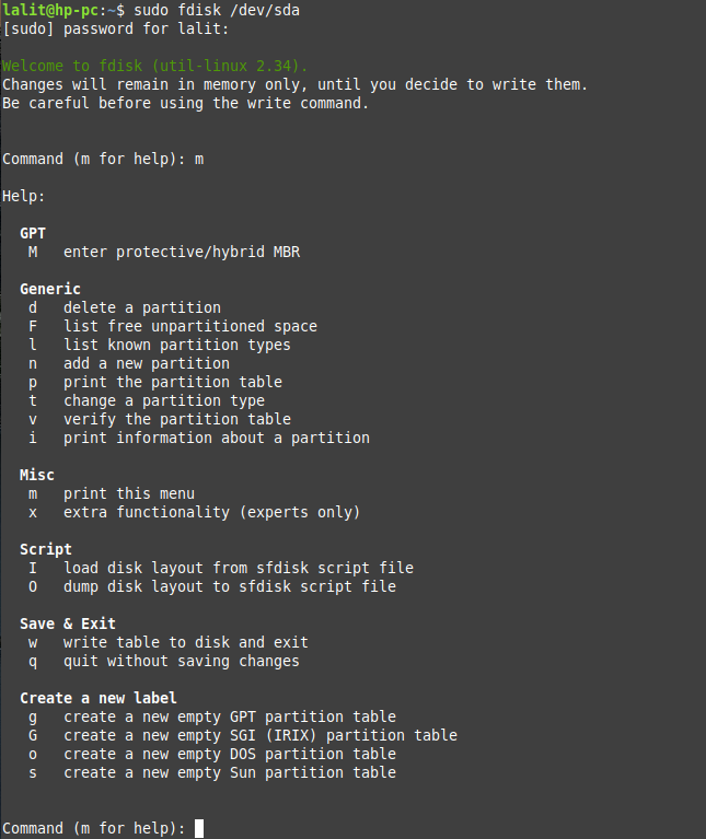 If you want to display the list of fdisk commands then first run the given in your terminal –