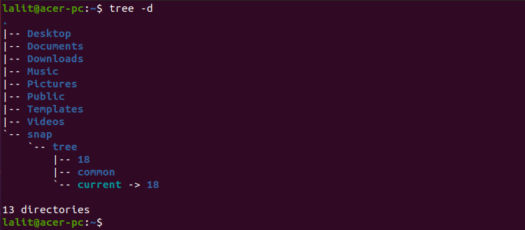 If you want to display directories only in the output of the tree command you can do this by using the option -d with the tree command. Now see the full command which is given below –