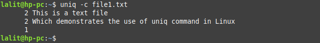 By using option -c you can display the number of times a line is repeated. Now execute the following command to display the count of line repetition.