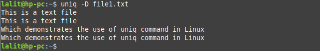 By using option -D with uniq command will print only duplicate lines of text. Use the following command –